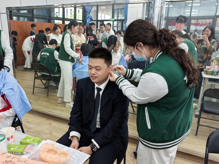 大操场一侧的“投壶雅戏”和“蹴鞠九宫格”摊位前人潮涌动,高一学生们亲手制作的竹矢与皮鞠,生动再现了《东京梦华录》中的古典竞技场景。本次游园活动还特别邀请了北京中医药大学的研究生们,他们现场指导学生们如何把脉识症、认识人体穴位,并通过舌诊图谱教授体质辨识的方法。