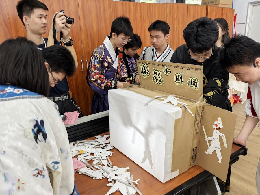 特色展位甲骨破译局、古建榫卯馆、皮影小剧场,更是园内名副其实的“文化顶流”,令游园的师生流连忘返。甲骨破译局通过猜字游戏,揭开商周先民的智慧之谜;古建榫卯馆则利用冰棍棒搭建斗拱模型,让参与者领略“无需一钉”的精湛营造技艺;而皮影小剧场的摊位上,学生们自编《大闹天宫》剧本,以卡纸皮影生动演绎这一经典故事。