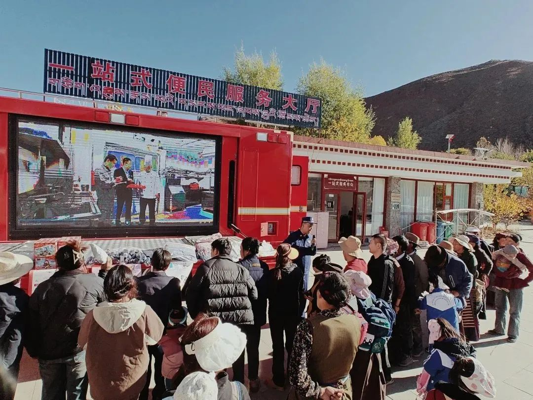 活动中,消防宣传车穿梭于大街小巷、旅游景区、农牧村庄、寺庙古刹、山区林地、企业单位等地,车身上的LED大屏幕循环播放的火灾警示教育片、“雪域消防说”科普短视频、“牛叔带小央,一起消防”藏汉双语系列科普动漫,吸引了众多群众驻足观看。“遇火情,莫慌张,弯腰低姿快撤离,电梯千万不能乘!”“波啦,防火不是一阵风,天天都得记心中!莫啦,今天学的知识,回家和街坊邻居多念叨!平安才是最大的丰收!”“小哥哥,提、拔、握、压要记牢,对准火苗根部喷,小火灭在萌芽中!”“伯伯嬢嬢,电动自行车不要进楼入户!电瓶也不要拿回家充电!一旦爆炸了不得了,无处可逃!”“一旦发现燃气泄漏,第一时间开窗通风,千万不要打电话!不要开关电器开关!不要使用打火机!”宣传员们一边给群众发放消防知识手册、消防文创礼品,一边用通俗易懂的语言,结合近期典型火灾案例,详细讲解家庭用火用电用气安全、火灾报警要点、初起火灾扑救方法以及逃生自救技巧等知识,进一步提升了群众消防安全知识的知晓率。