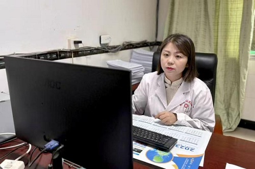 威远县新店镇卫生院医生曹建菊正在撰写患者病历