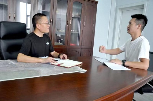 中心村党支部书记、主任陈孟高(右)与刘夕友总经理商量中药材产业的发展问题
