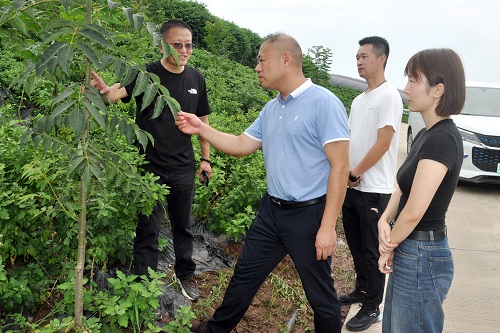 段镇长(中)在中药材基地了解黄柏的种植情况