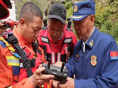 迅速响应、科学编组,构建专业救援体系。支队全勤指挥部和专业队伍到达现场后,将队伍划分为“管理、搜索、营救、医疗、战勤”等五大模块。基于吉隆口岸地势险峻、地形复杂等特殊地理环境,实时掌握灾情发展态势,精准分析研判重点风险区域,果断采取“人机协同、空地水联动”的立体搜救模式抢抓黄金救援时间,科学组建“1个水域搜救组、1个山岳搜救组、1个无人机侦查组”,通过对比灾前、灾后现场图像,初步划定重点搜索区域,确定受灾房屋数量和人员失联位置。