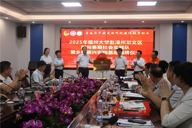 2025年,恰逢“绿水青山就是金山银山”理念提出20周年。为深入贯彻生态文明思想,激发乡村振兴活力,福州大学“赤脉承烽·云江绘绿”乡村振兴生态实践队前往漳州市龙文区开展“河小禹”专项实践及乡村实践调研活动。7月16日下午,福州大学党委书记陈国龙率队赴福州大学国家大学科技园(漳州),慰问环境与安全工程学院暑期社会实践队,举行乡村振兴实践基地揭牌仪式并召开漳州校友座谈会。