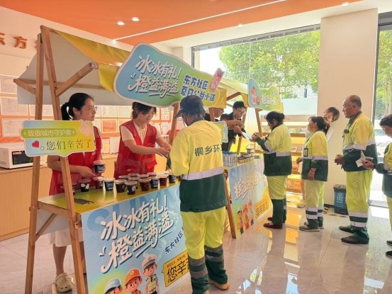 夏日炎炎,持续的高温天气给户外劳动群体带来了严峻的考验。为致敬每一位默默奉献的劳动者,感谢他们的辛勤付出,近日,桐乡市梧桐街道东方社区党群服务中心户外劳动者服务驿站积极发挥阵地优势,组织党员志愿者和反诈宣传员开展“‘冰冰’有礼‘橙益’满溢”夏日送清凉活动,为户外工作者送清凉、送关怀、送知识,应对高温“烤”验。