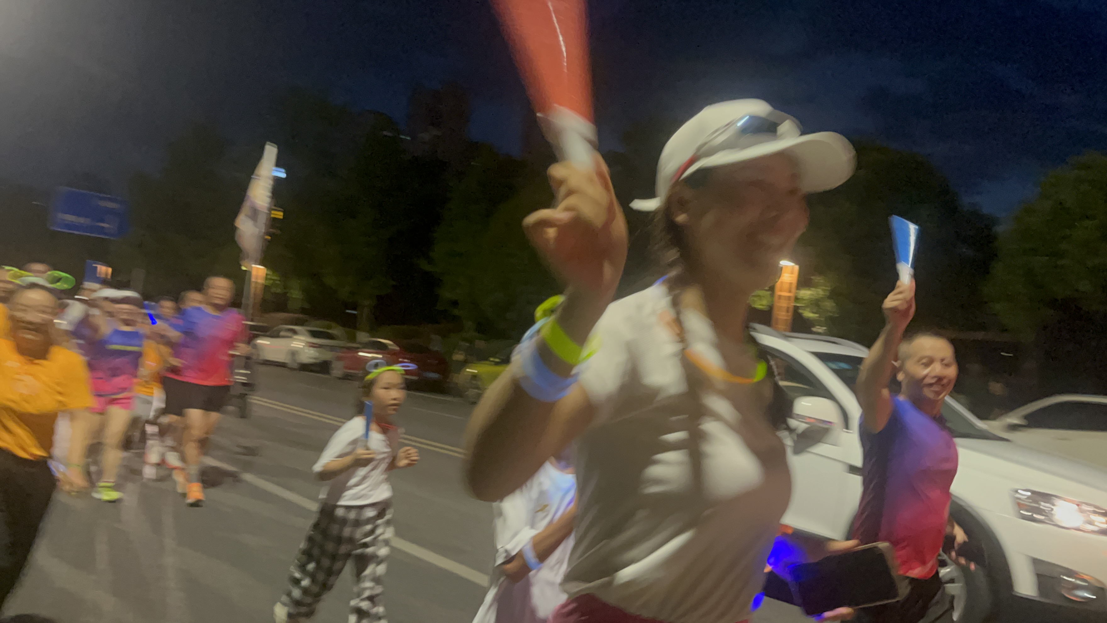 19时38分,随着发令枪响,四个荧光方阵如星河般涌动而出。年轻跑者们矫健的身影在跑道上划出闪亮的轨迹;亲子家庭手牵手奔跑,孩子们头上的荧光发箍在夜色中舞动;银发跑者们步伐稳健,用行动诠释“运动不老”的真谛。