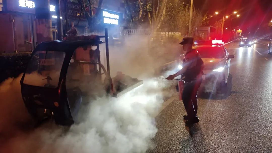 此时火势初起,且三轮车紧邻主干道,一旦油箱爆燃,后果不堪设想。吴皓临危不乱,一边指挥同事疏散群众、设置警戒区,一边熟练拔掉灭火器保险销,对准火焰根部喷射,不到5分钟就扑灭明火。为防止复燃,他又仔细检查车辆底盘、电瓶等关键部位,确认无隐患后才放心离开。车主激动地说:“多亏你们来得快,不然我的车就烧没了,还可能出大事!”