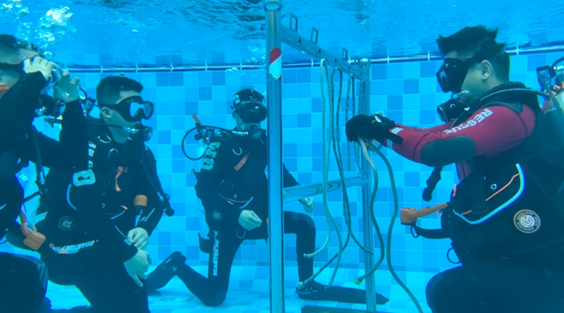 “哗啦”一声,指战员们已穿戴整齐:贴身的潜水衣、清晰的护目镜,还有那背负在肩,重达30斤的空气瓶,如同忠诚的伙伴。平静水域训练正式开始,一系列看似基础却至关重要的技能逐一展开——从入水前的精心准备、利落的入水姿势,到水下灵活更换呼吸头、巧妙自救脱困、稳定控制浮力、自如下潜上浮、快速排出面镜积水、水下绳结制作,再到极具挑战的水下切割……每一项训练,都在锤炼着他们成为“水陆全能”的救援精英。