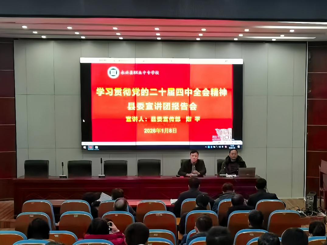 2026年1月8日,学习贯彻党的二十届四中全会精神县委宣讲团走进永兴县职业中专学校,县委宣传部副部长陈平作专题报告,永兴县职业中专学校全体师生参加报告会。