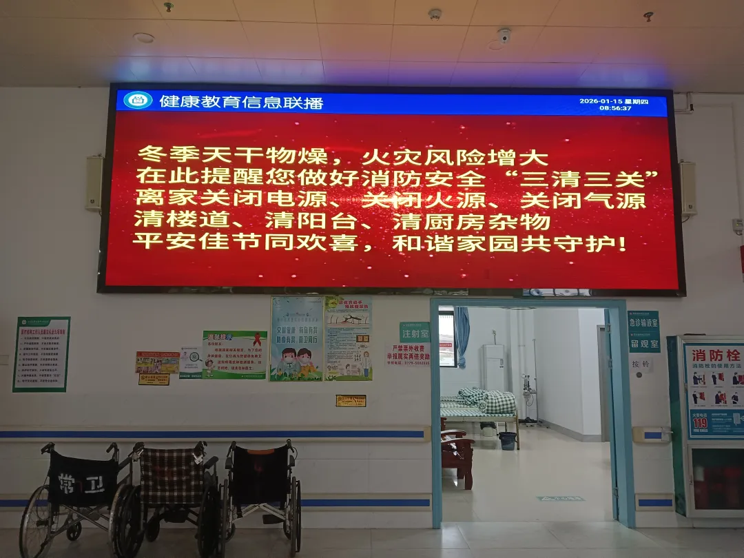 崇左消防在龙州县中医医院,依托院内显示屏滚动播放“三清三关”家庭防火提示,把消防安全融入就医场景,为平安诊疗环境筑牢防线。