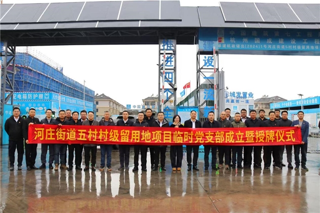为深入贯彻钱塘城发党委决策部署,推动党建工作与项目建设深度融合、同频共振,凝聚各参建单位攻坚合力,河庄街道五村村级留用地项目临时党支部成立授牌仪式在项目北地块隆重举行。钱塘城发集团党委委员、纪委书记、监事会主席张国华,党群工作部(人力资源部)部长龚玲燕,钱塘城发置业总经理吴跃林,中建八局东北公司党群序列高级专家苏新河,及各参建单位负责人、党员代表共同出席仪式。
